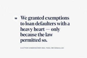 On the issue of many loan defaulters getting their candidacies back, Election Commissioner Abul Fazal Md Sanaullah said, “We granted exemptions to loan defaulters with a heavy heart — only because the law permitted so.”
