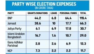 In contrast, Jamaat-e-Islami reported that 58 percent of its campaign budget will be financed through grants and donations, including party funds. The National Citizen Party stated that 62 percent of its election spending will rely on grants and donations.