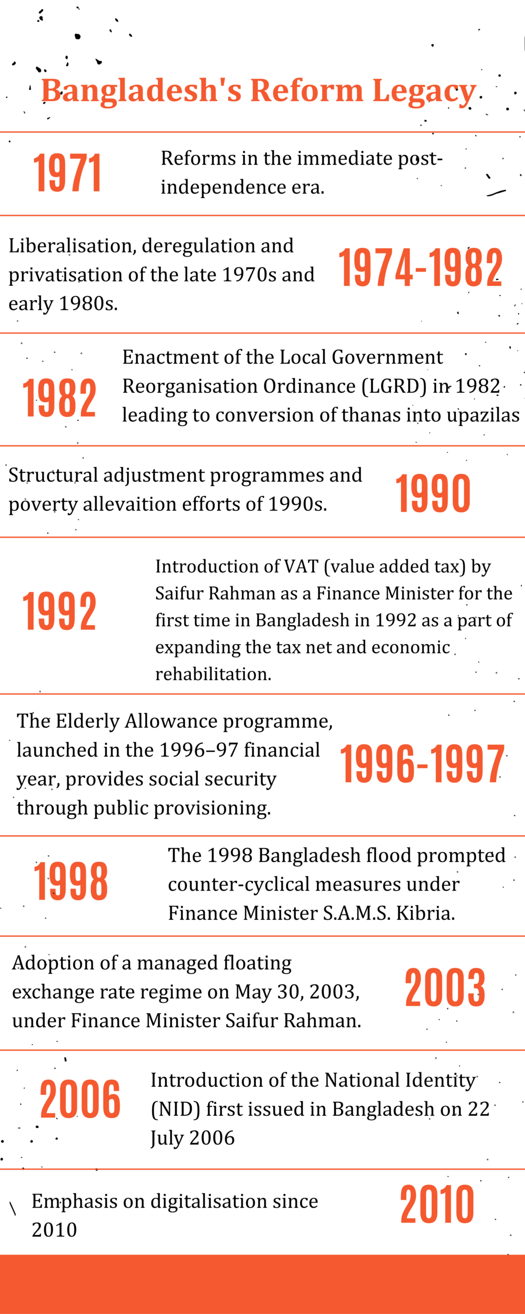 Bangladesh is not new to attempts at reform; some originated from utter necessity, while others emerged in response to pressures exerted by development partners. Over the decades, the country has experienced waves of economic, political, and institutional restructuring—driven by macroeconomic pressures, shifting political incentives, and critical junctures that created opportunities for change. These reforms aimed to address challenges concerning institutional effectiveness, macroeconomic management, and the functioning of organs of state, particularly in the general area of good governance. The success of such endeavours, however, critically hinged on political commitment and overcoming of vested interests, far more than on technical capacity alone. When this was not possible, reforms either failed or did not deliver the expected results. As the post-August 2025 landscape attempts to reshape institutions and governance and adhere to public expectations, revisiting Bangladesh’s reform trajectory has assumed heightened importance.